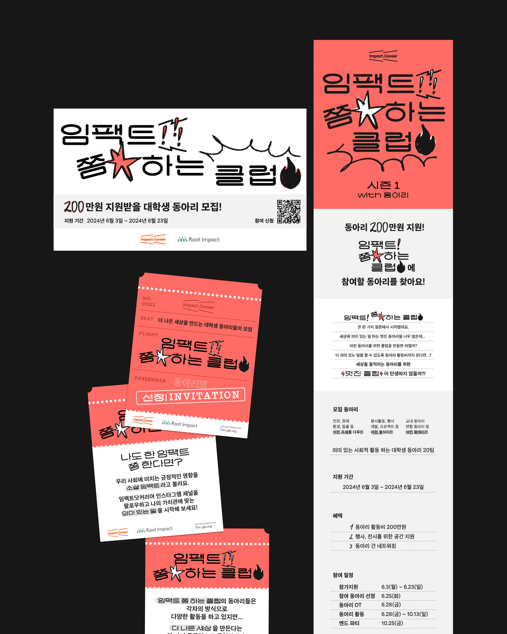 전국의 멋진 소셜 동아리들을 이어보는 ‘임팩트 쫌 하는 클럽’을 디자인 했습니다. 시즌제로 운영되는 팝업 커뮤니티로 소셜 동아리들이 함께 모여 빠르게 커뮤니티를 만들고 클럽 활동 기간 교류합니다.