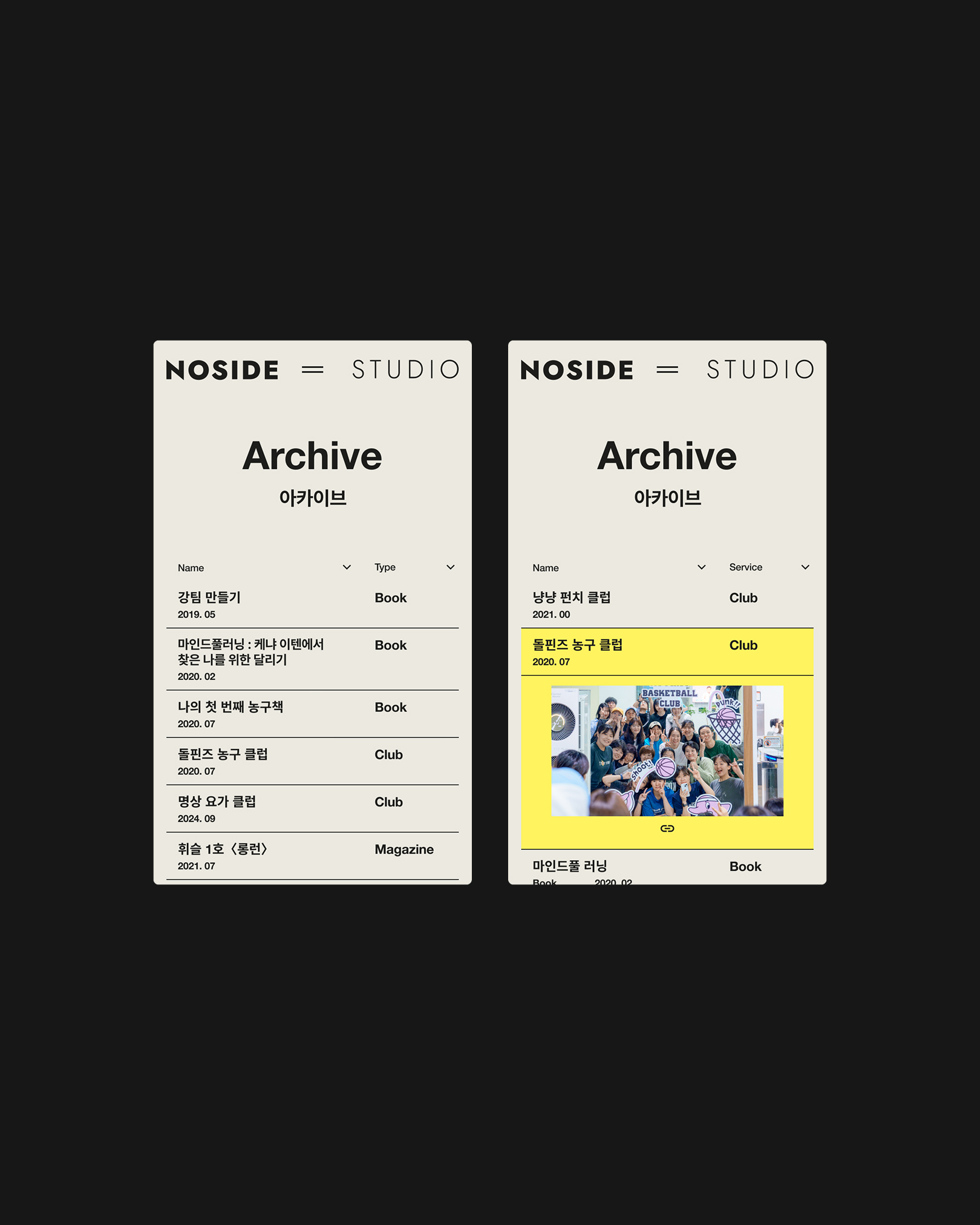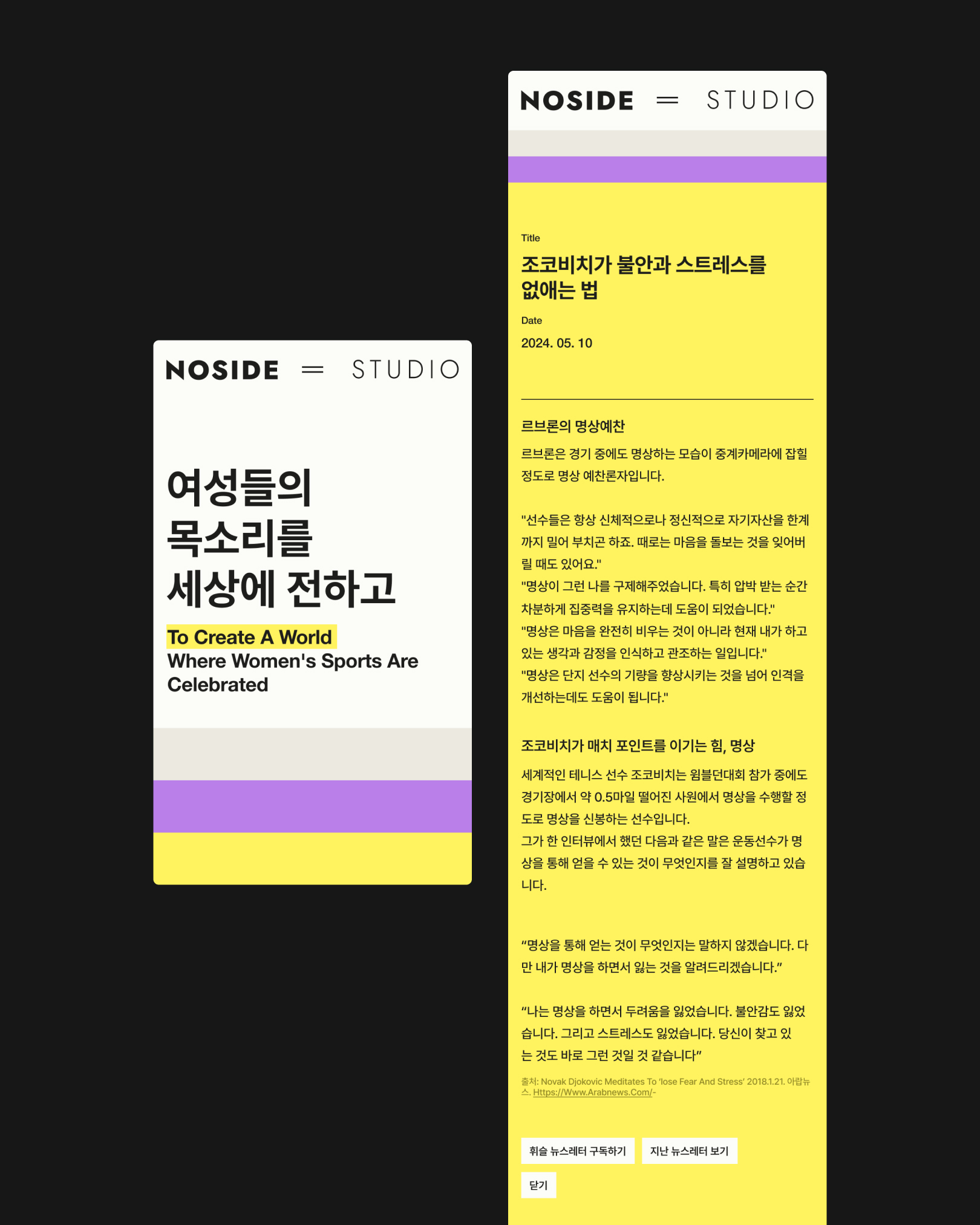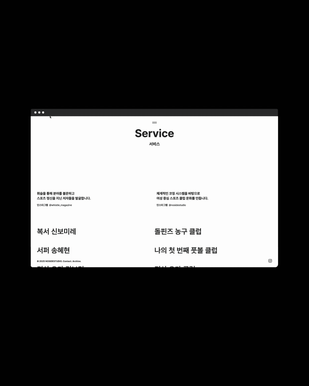 ‘노사이드(No-side)’는 럭비에서 사용되는 용어로, 경기가 종료되면 승패에 관계없이 모두가 친구가 된다는 스포츠 정신을 뜻합니다. 이 가치관을 기반으로 책, 잡지, 영상 콘텐츠를 만들고 여성 스포츠 선수와 코치를 발굴, 여성 스포츠 클럽을 운영하는 노사이트 스튜디오의 웹사이트 작업입니다.