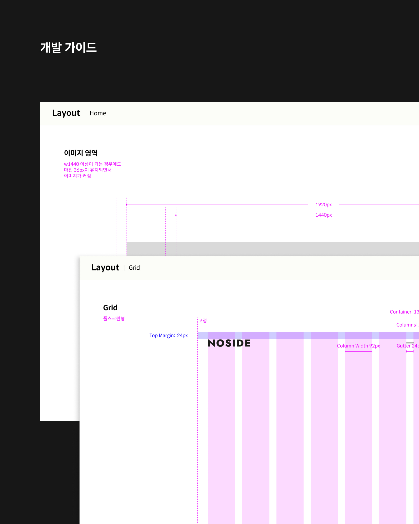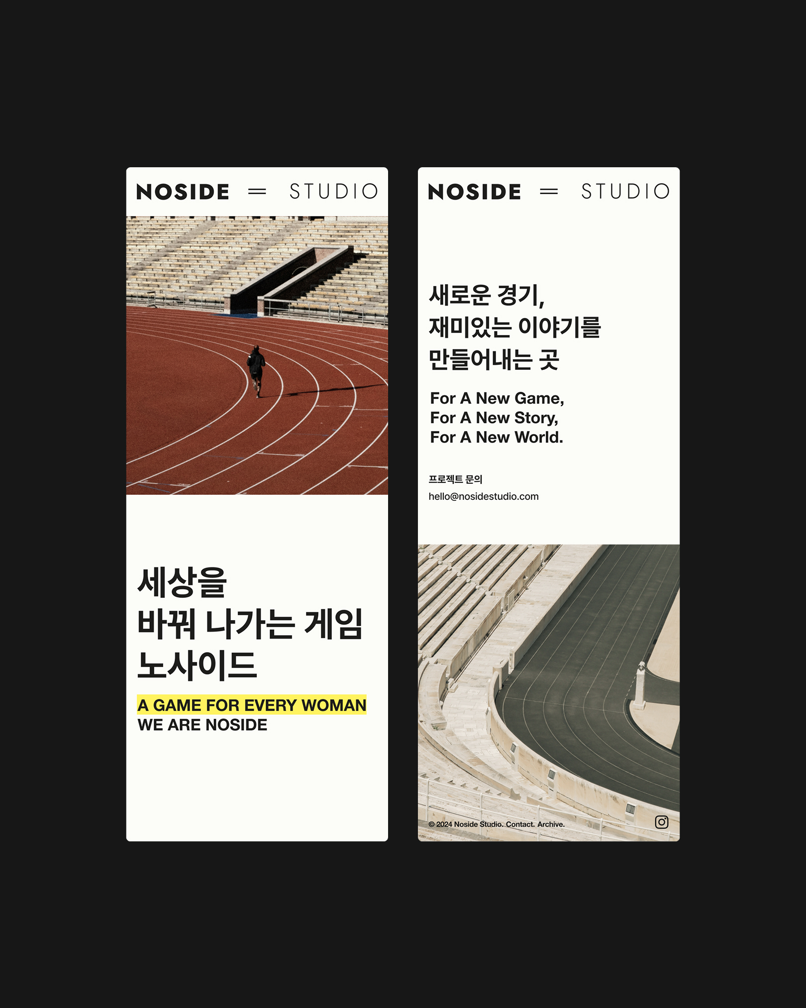 화면 제안에서부터 디자인, 개발 소통까지 짧은 시간 긴밀한 협업으로 진행되었습니다. 마치 전/후반전 경기를 모두 뛴 느낌이랄까요! 이야기를 짓는 곳에서 하나의 게임을, 저마다의 룰을 가진 스포츠 분야까지 영역을 넓히고 있는 노사이드의 현재를 담아내기 위해 메시지를 짓고 이를 프레젠테이션 구성으로 디자인했습니다.