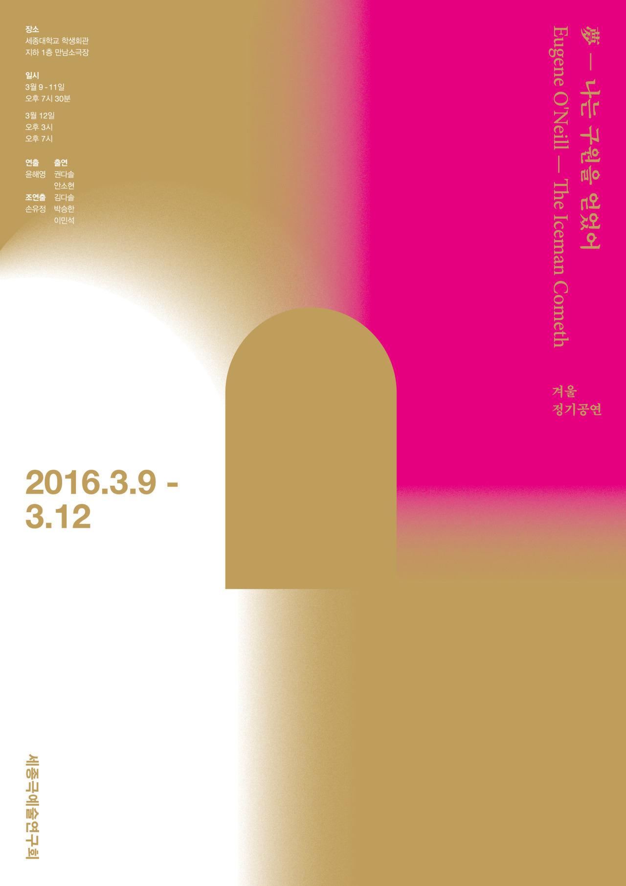 세종극예술연구회의 겨울 정기공연 <몽 - 나는 구원을 얻었어>의 포스터와 프로그램북을 진행했습니다. <몽 - 나는 구원을 얻었어>는 현실을 잊은 채 백일몽에 빠져 사는 친구들과 그들을 구원하려는 히키에 대한 이야기입니다. ‘꿈 - 현실 - 이상적인 삶’ 사이에서 무언가를 택해야만 하는 주인공들의 심리와 상황을 창문의 형태를 통해 표현하였습니다. 금색과 산세리프의 서체는 ‘이상적인 삶’을, 분홍색과 세리프 서체는 ‘꿈’을 뜻하기 위해 사용하였고, 방사형으로 퍼지는 색들은 그들의 꿈이 뻗어나가는 모습을 의미하기도 합니다.