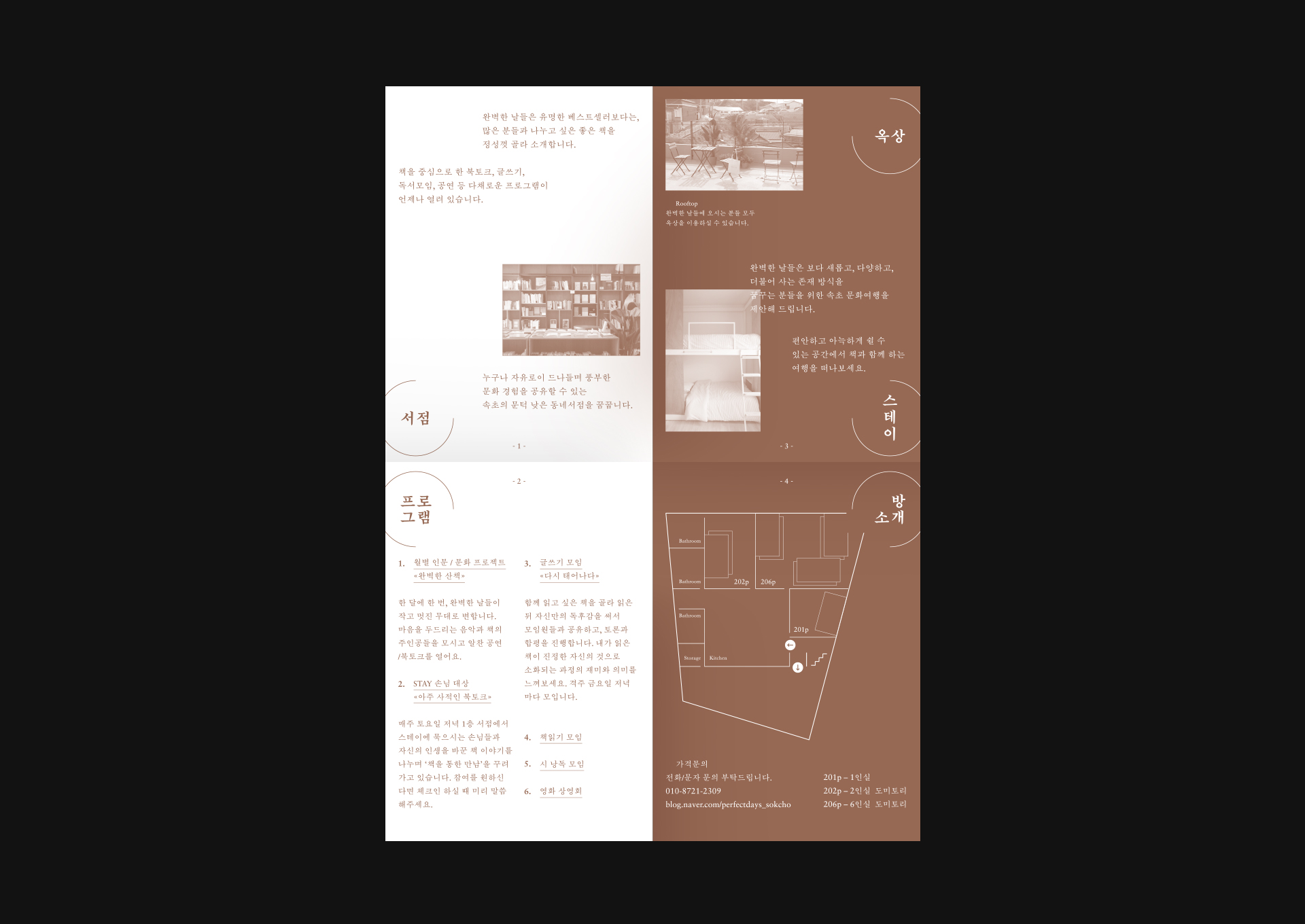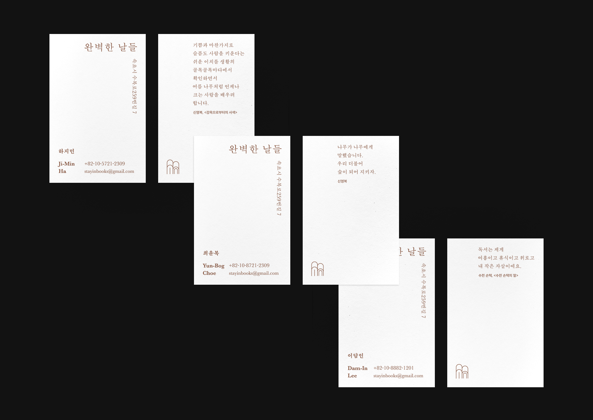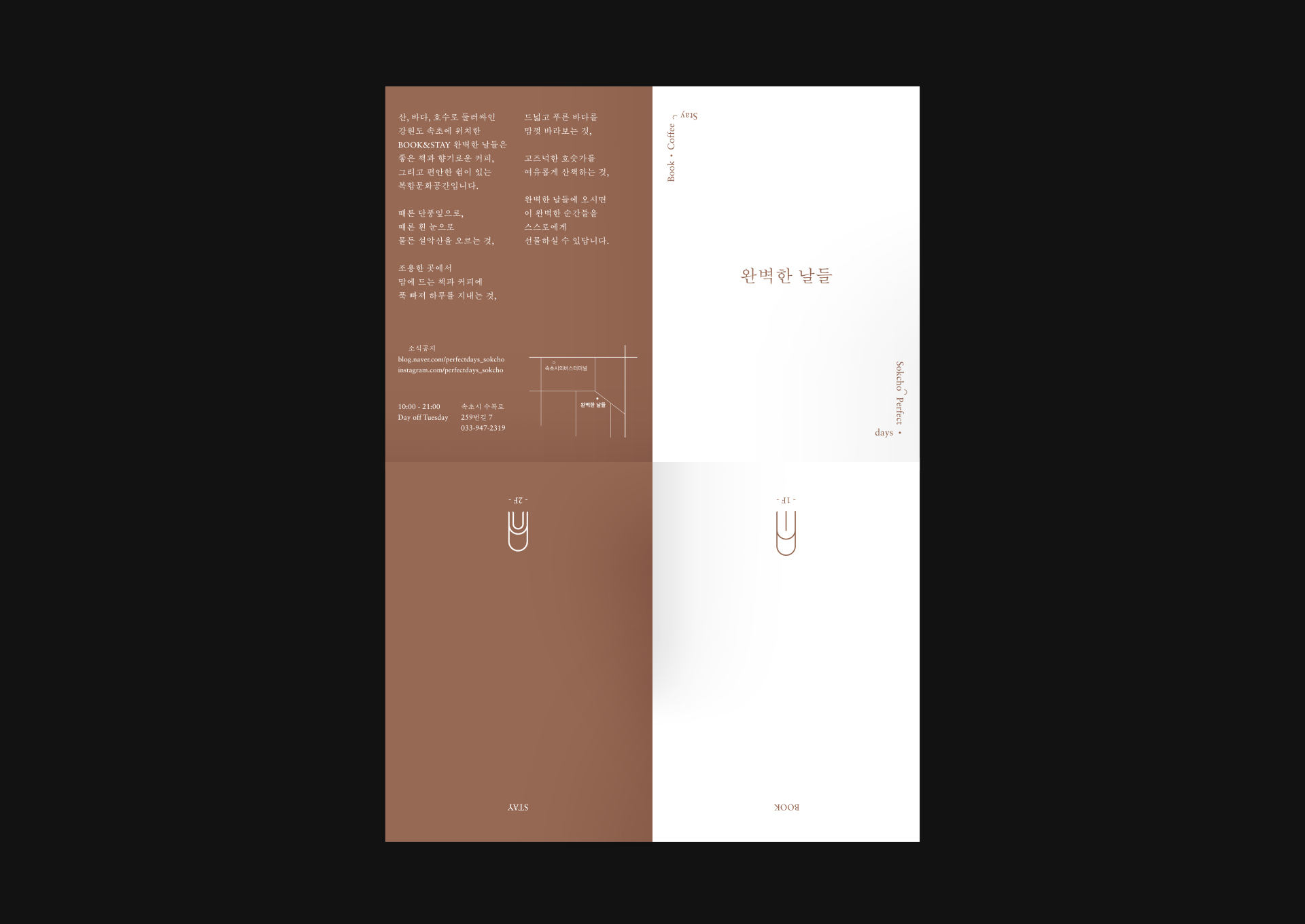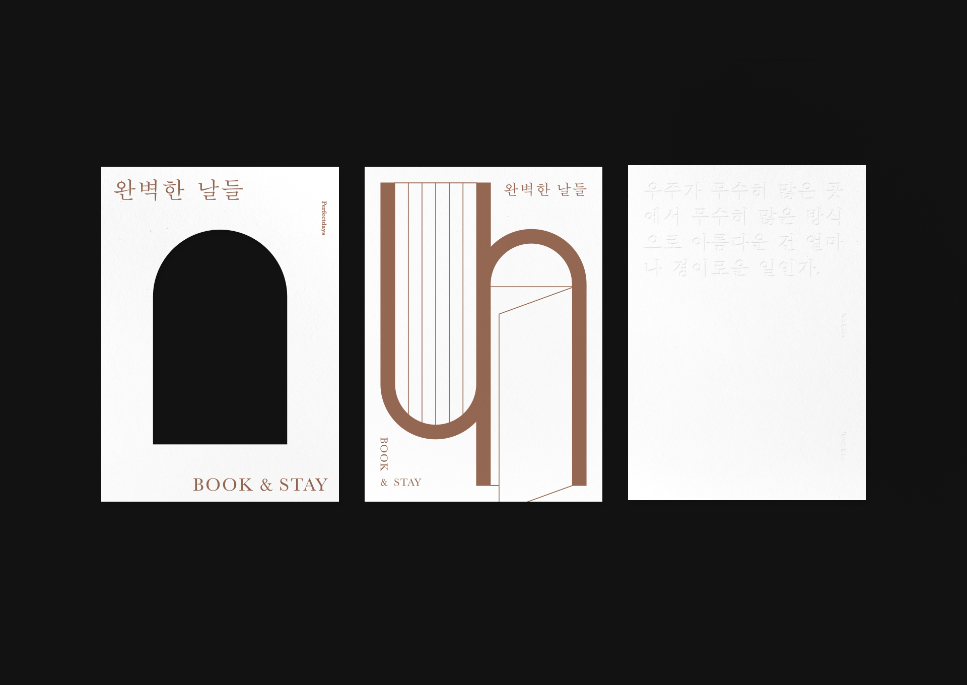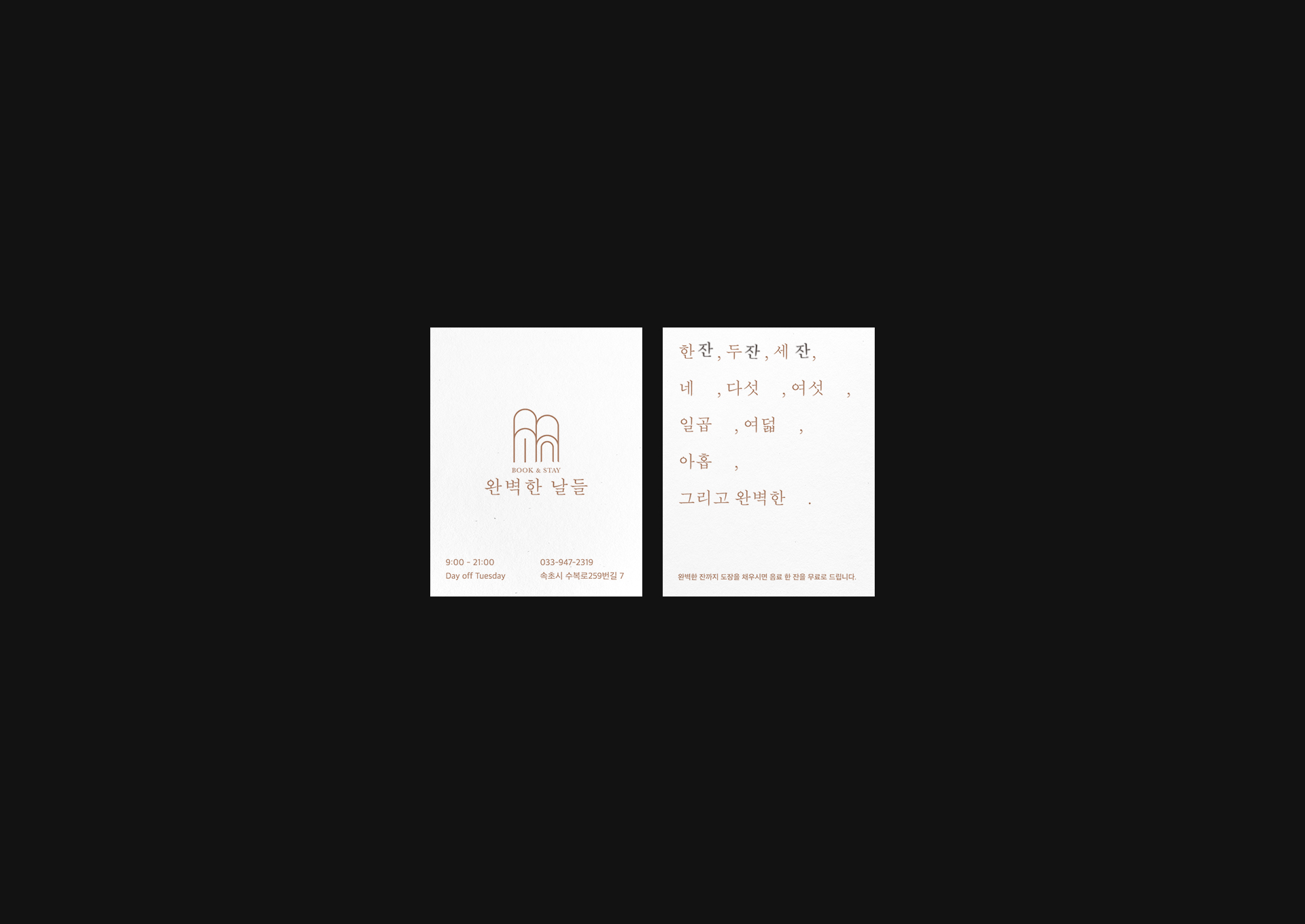 강원도 속초에 위치한 Book&Stay 완벽한 날들의 브랜딩 작업입니다. 메리 올리버, 『완벽한 날들』 책에서 영향을 받아 따듯한 서점을 원하셨고, 저희는 책과 아치형 문을 가진 건물을 본따 로고를 디자인하였습니다. 사이니지나 전반적인 인쇄물은 공간에 잘 녹여들도록 소박하게 멋을 내었습니다. 이번 여름휴가는 책과 쉼, 산과 바다, 호수가 있는 속초로 떠나보는 것은 어떨까요?
