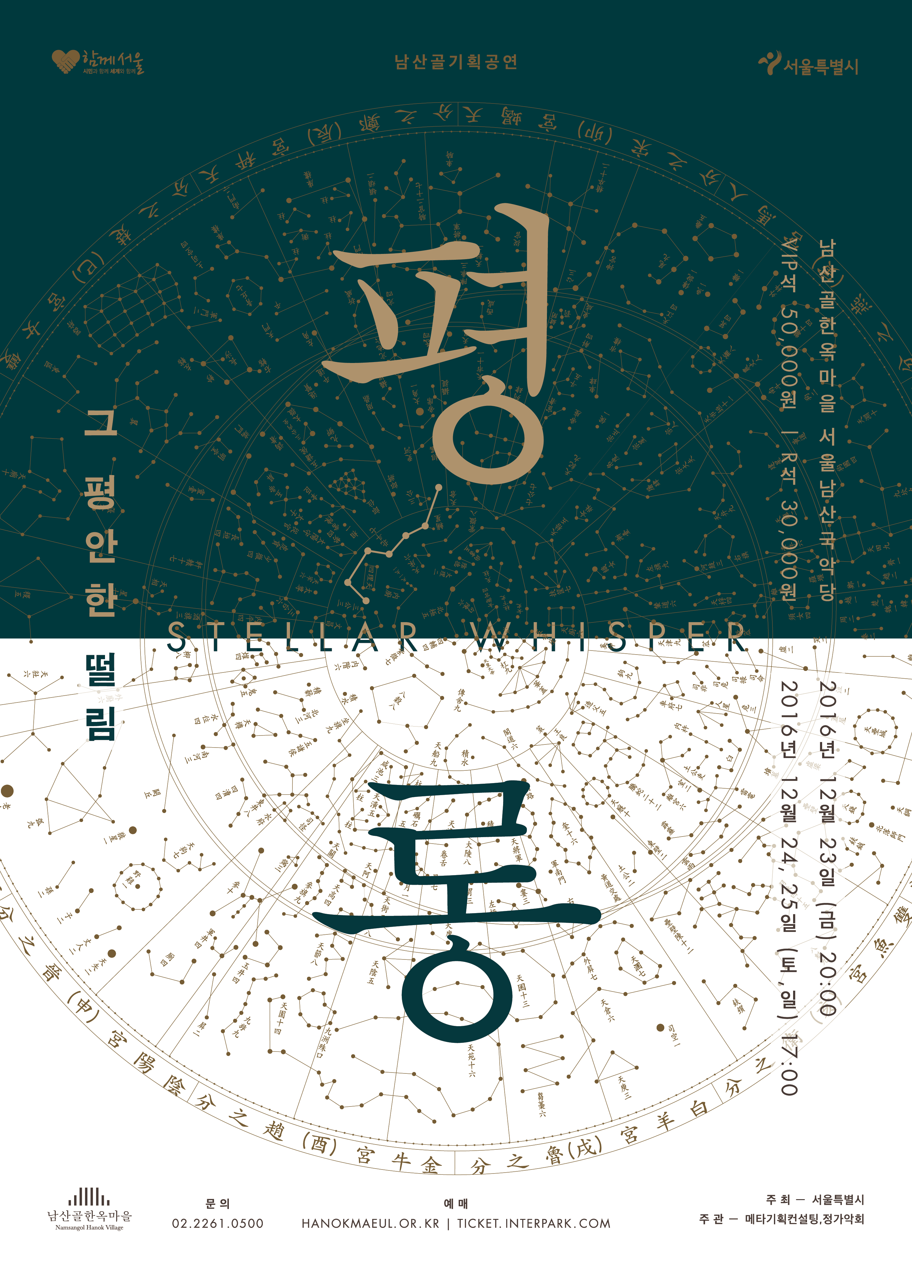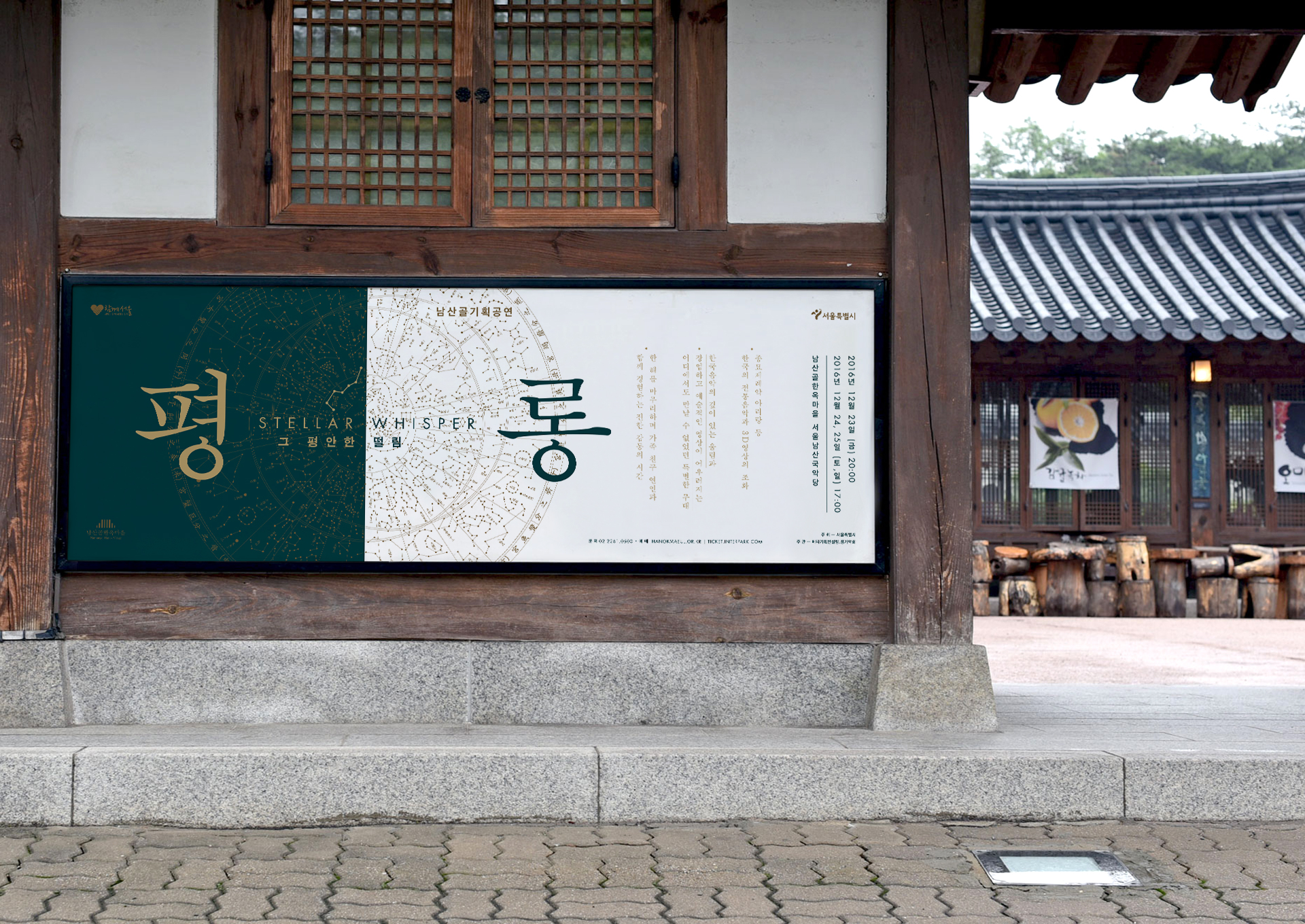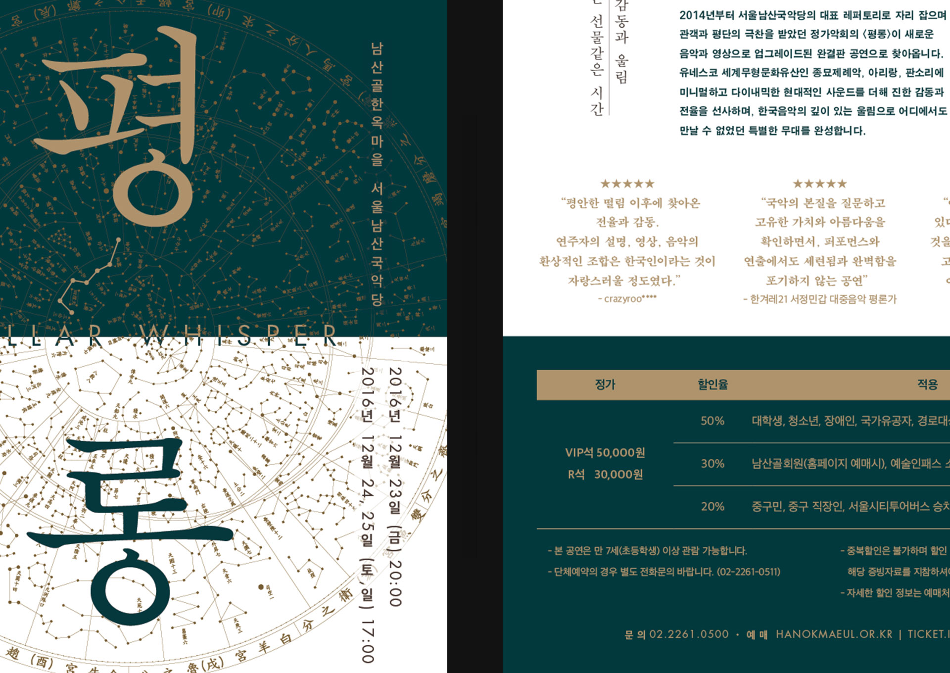 <평롱>은 ‘북두칠성'을 포함한 별자리를 나타내야 한다는 요구가 분명했다. 무대 연출은 화려했고 공연 시기 또한 크리스마스 즈음이어서 ‘현대적'이면서 ‘특별한’ 공연임이 부각되어야 했다. 서체의 세로쓰기와 금별색으로 예쁘게 만들어보았다. 원형의 그래픽 요소를 적극적으로 썼고 디렉터 아이디어로 국악당에 걸리는 배너는 초록색과 빨강색으로 연말 분위기를 살렸다. 프로그램북 표지는 앞, 뒤 질감이 다른 팬시크라프트를 쓰고 싶었는데 종이를 잘못 알고 있는 바람에 인쇄 부분이 아쉽게 되었다. 남산골한옥마을은 언제나 나이스한 클라이언트!