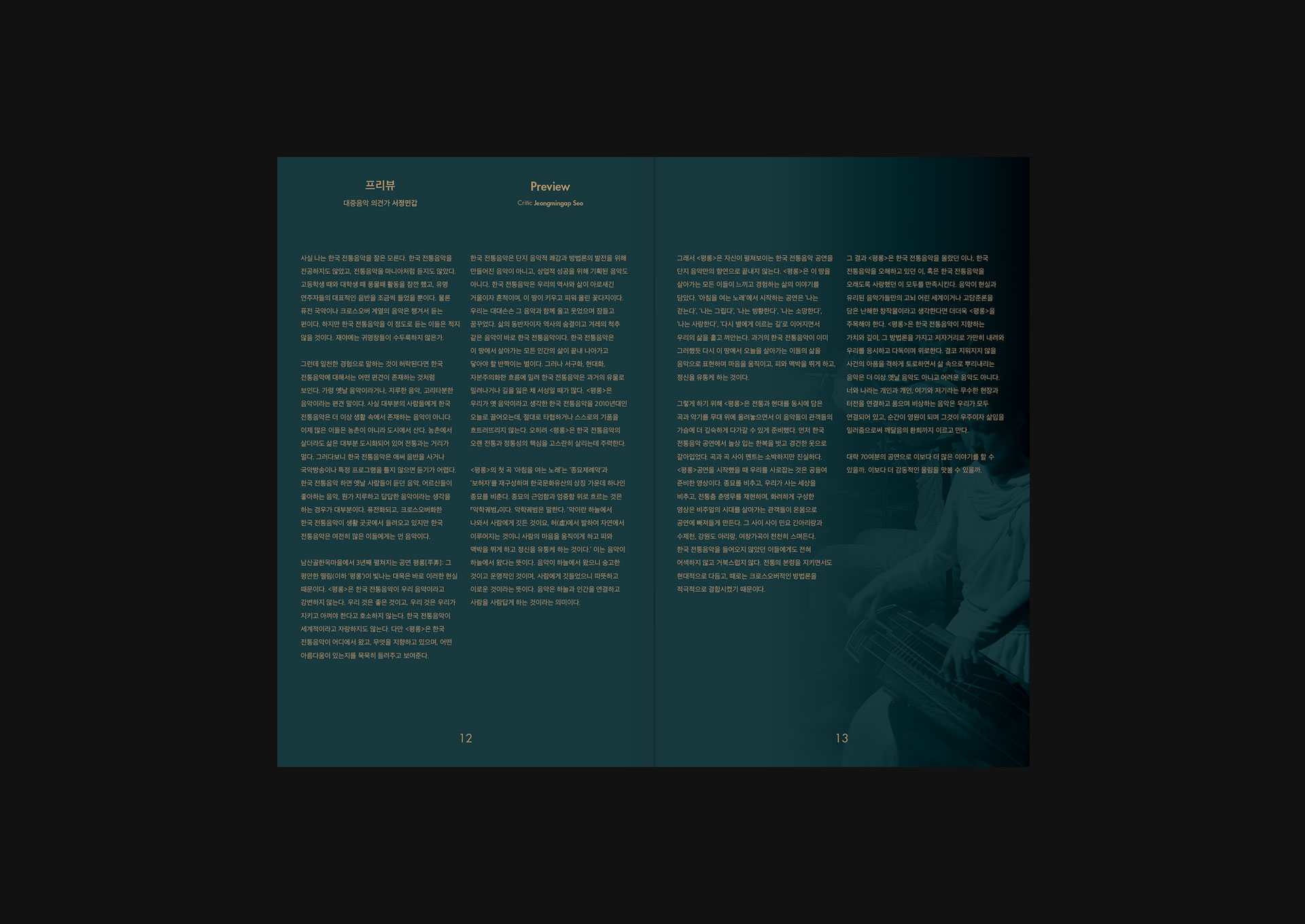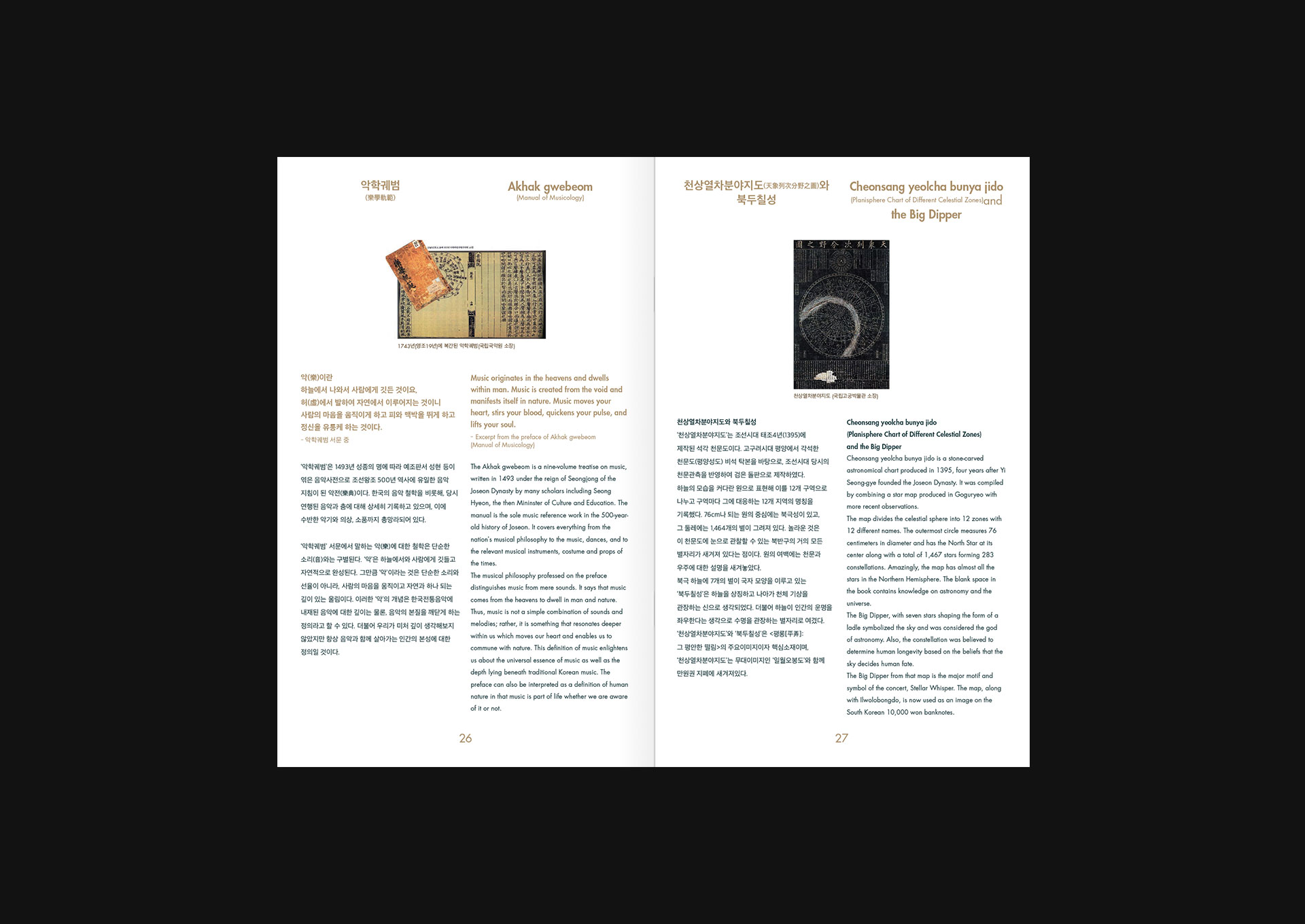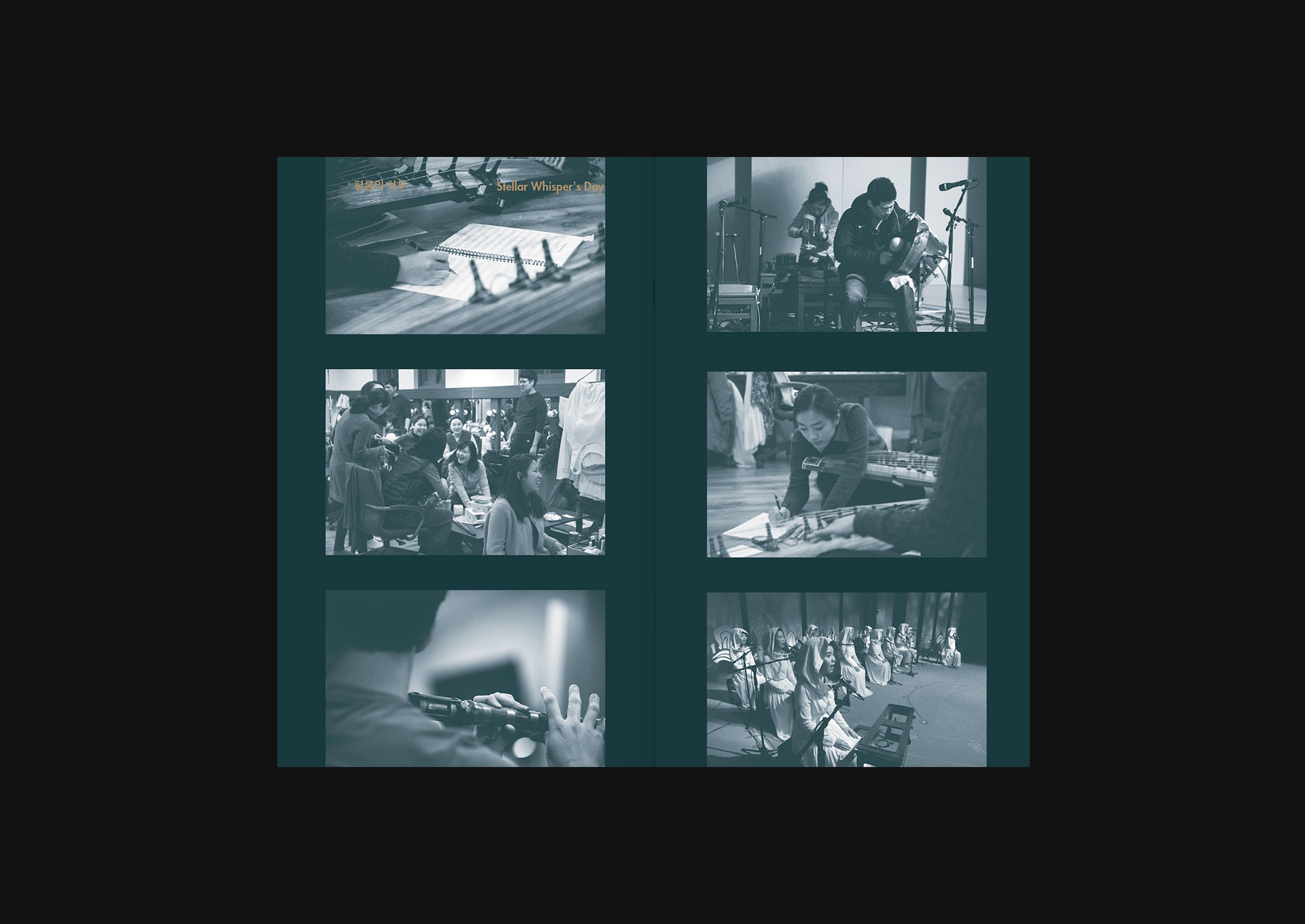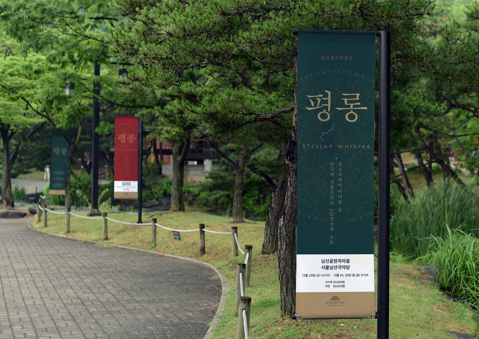 <평롱>은 ‘북두칠성'을 포함한 별자리를 나타내야 한다는 요구가 분명했다. 무대 연출은 화려했고 공연 시기 또한 크리스마스 즈음이어서 ‘현대적'이면서 ‘특별한’ 공연임이 부각되어야 했다. 서체의 세로쓰기와 금별색으로 예쁘게 만들어보았다. 원형의 그래픽 요소를 적극적으로 썼고 디렉터 아이디어로 국악당에 걸리는 배너는 초록색과 빨강색으로 연말 분위기를 살렸다. 프로그램북 표지는 앞, 뒤 질감이 다른 팬시크라프트를 쓰고 싶었는데 종이를 잘못 알고 있는 바람에 인쇄 부분이 아쉽게 되었다. 남산골한옥마을은 언제나 나이스한 클라이언트!