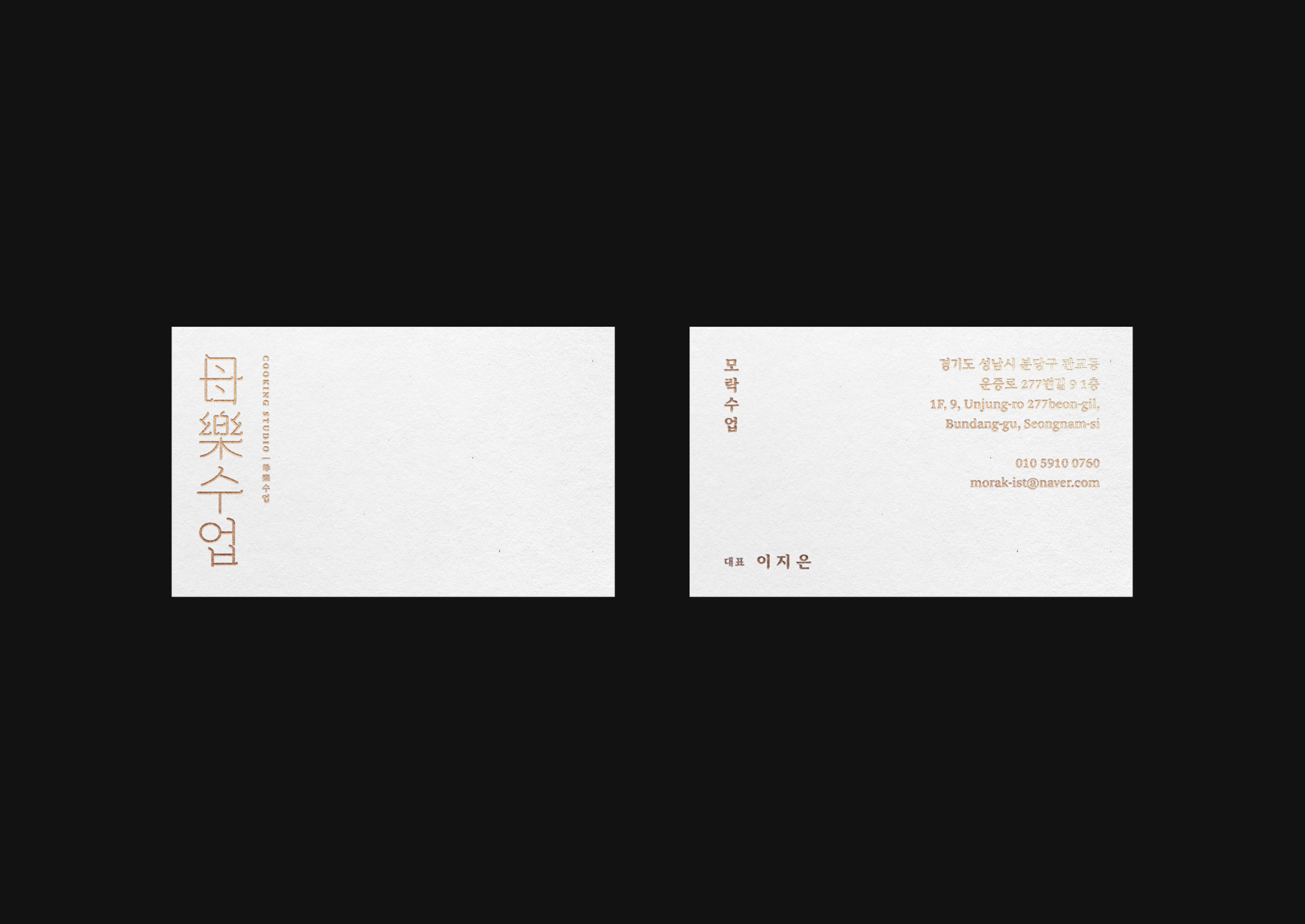 '母樂수업'은 '엄마의 즐거움'이라는 뜻의 따뜻한 가정식을 배울 수 있는 쿠킹스튜디오 입니다. 클라이언트의 요리솜씨와 공간의 활용을 생각해 친근한 네이밍을 제안드렸습니다. 맛있는 냄새가 모락모락 피어나는 주방을 상상하며 누구나 쉽게 배울 수 있는 요리, 가족들을 위한 건강한 요리를 담아내고자 했습니다. 주방에서 많이 볼 수 있는 스테인레스 소재에 금박이나 코튼지같은 재질감으로 따뜻한 톤을 더해 포근한 주방이 되도록 하였습니다.