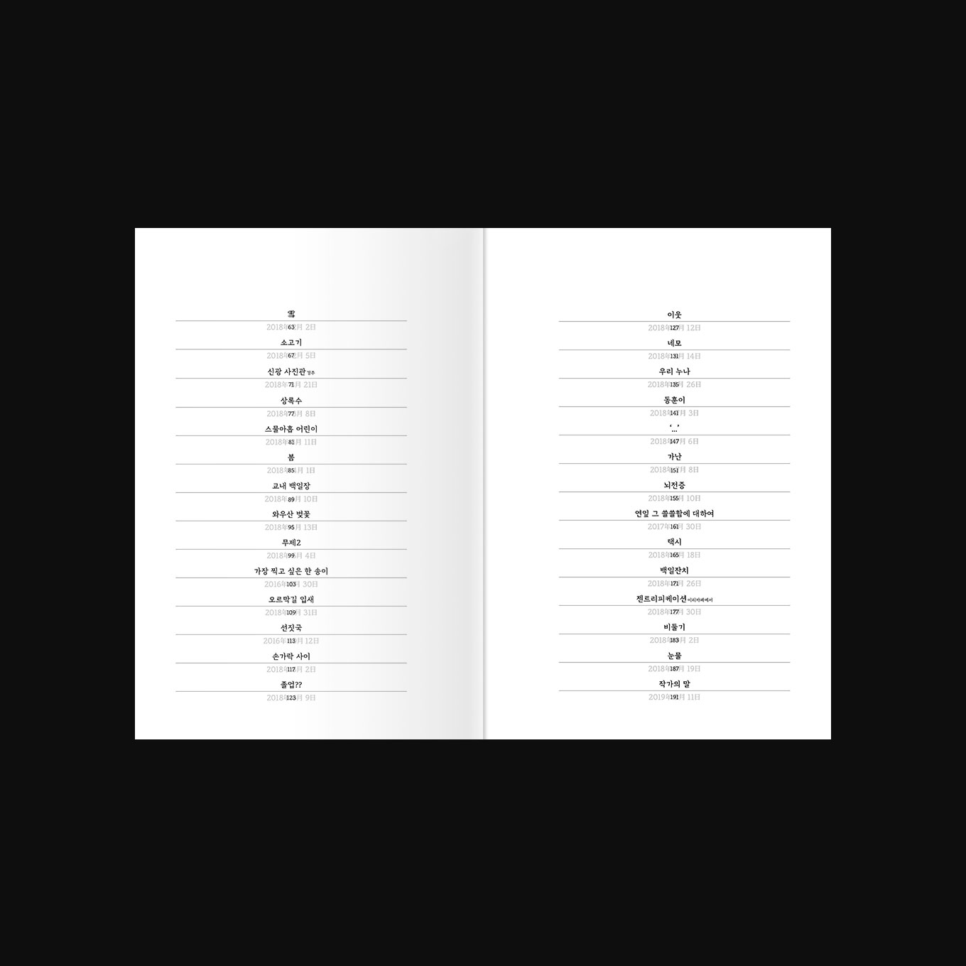 학준과의 3번째 책 작업입니다. 그동안의 분위기와는 다른 모습을 원했고 초고를 읽고 이런 저런 이야기를 나누나 보니 그에게서 늘 느껴졌던 글에 대한 갈증과 그 갈증에 대해 말하는 ‘여유없이 할 말이 많아 빽빽한' 상태를 담고 싶었습니다.