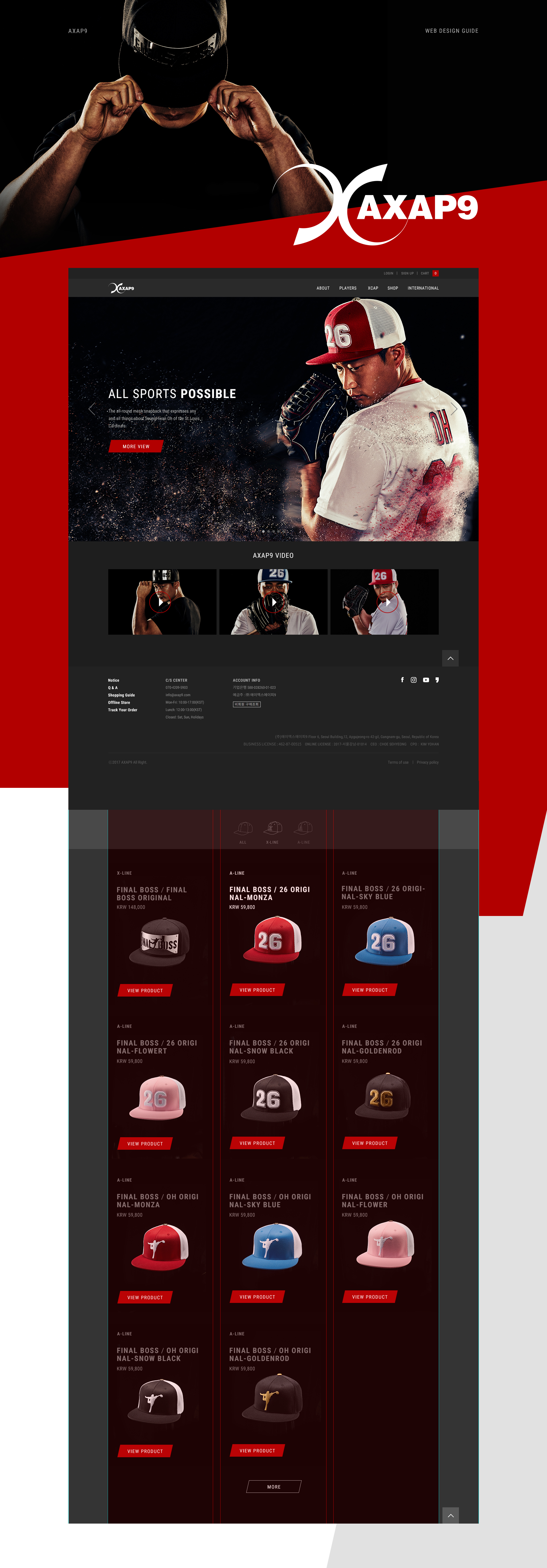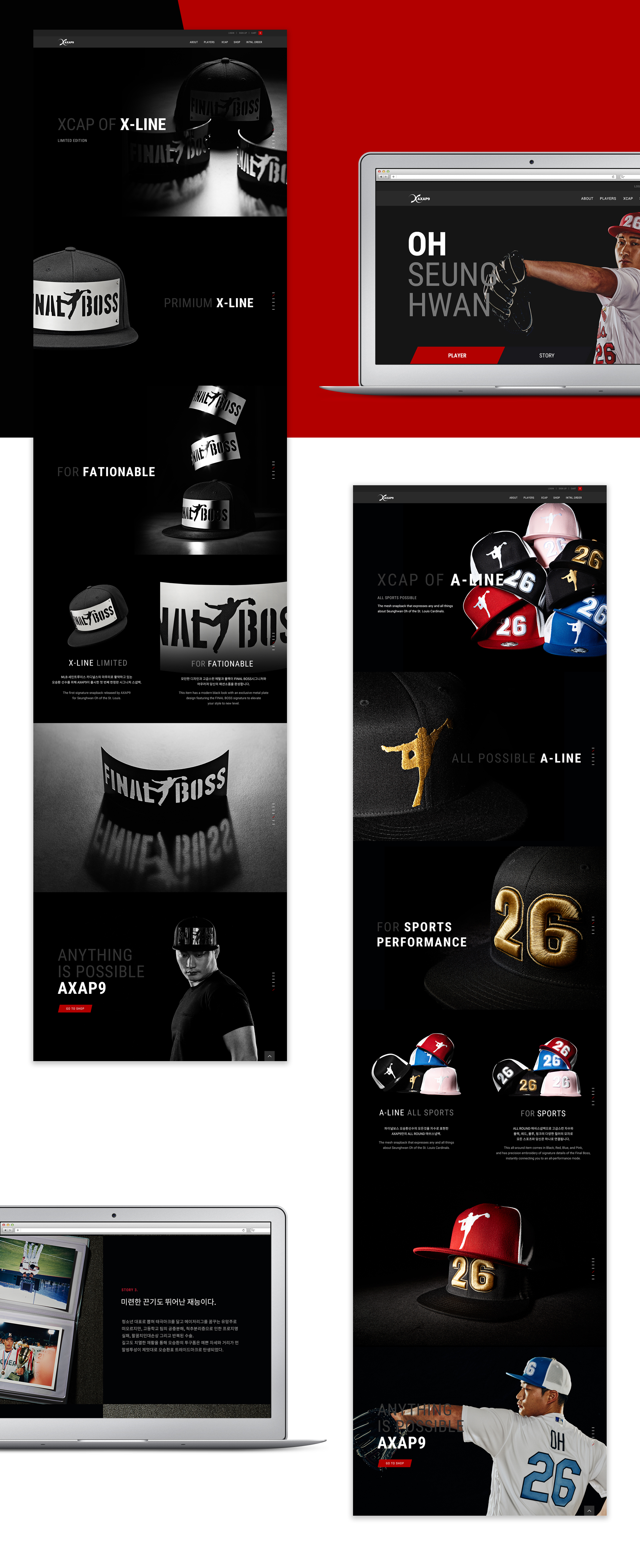 프로야구 시즌 개막에 맞춰 오픈한 야구 아이템 관련 쇼핑몰 AXAP9입니다. 프로 야구 선수와의 긴밀한 협업을 통해 패션 아이템을 제작하는 브랜드로 강렬한 스피드와 무게감을 담아내려고 하였습니다. 선수들을 멋지게 담아낸 사진 덕분에 고퀄리티의 사이트를 감상 하실 수 있습니다.