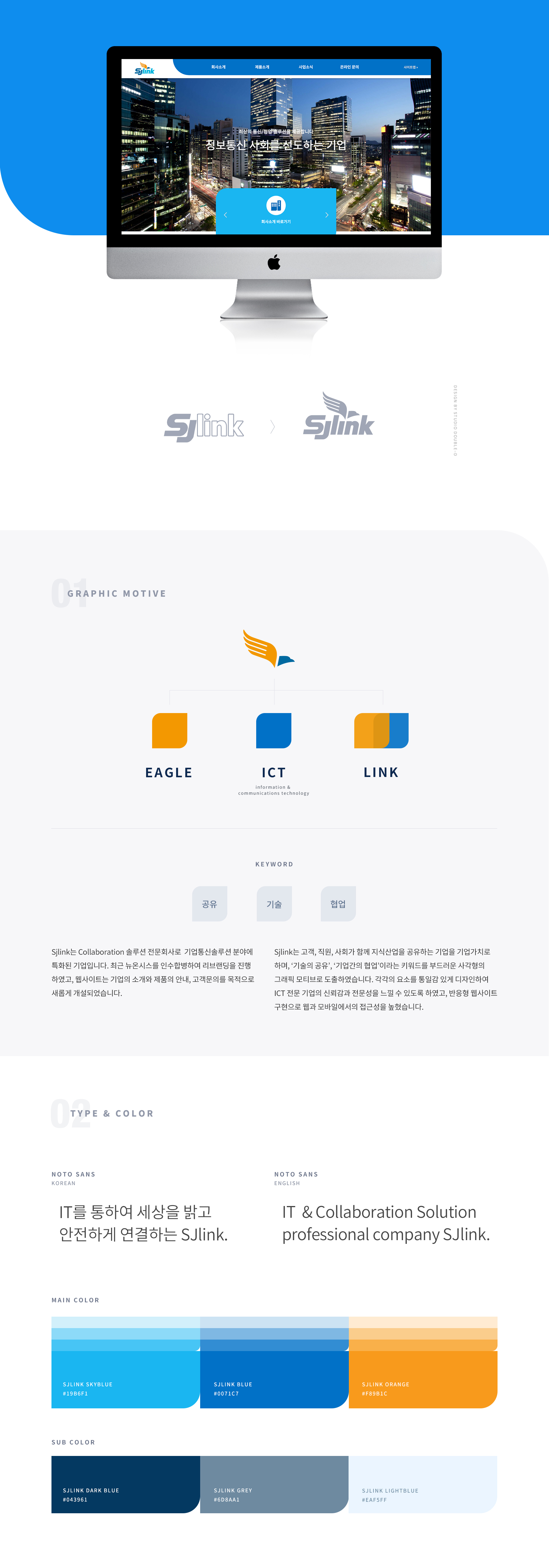 ICT & Collaboration 전문기업 SJlink의 웹사이트 리뉴얼을 진행했습니다. 부드러운 사각형 모티브와 기술성을 나타내는 푸른색, 사이트 내 이동을 유도하는 주황색의 사용으로 IT기업의 생동감을 담았습니다. 또한, 내부 컨텐츠를 인포그래픽으로 다듬어 고객의 이해를 돕도록 하였습니다. Look&Feel이 통일된 디자인은 시각적으로 편안해 보일 뿐만 아니라, 브랜드의 신뢰도를 높힙니다. 저희는 작은 요소이지만 사진, 아이콘, 버튼 등 웹사이트를 구성하는 요소와 이를 뒷받침 할 수 있는 구현으로 브랜드의 결을 개선하고자 하였습니다.