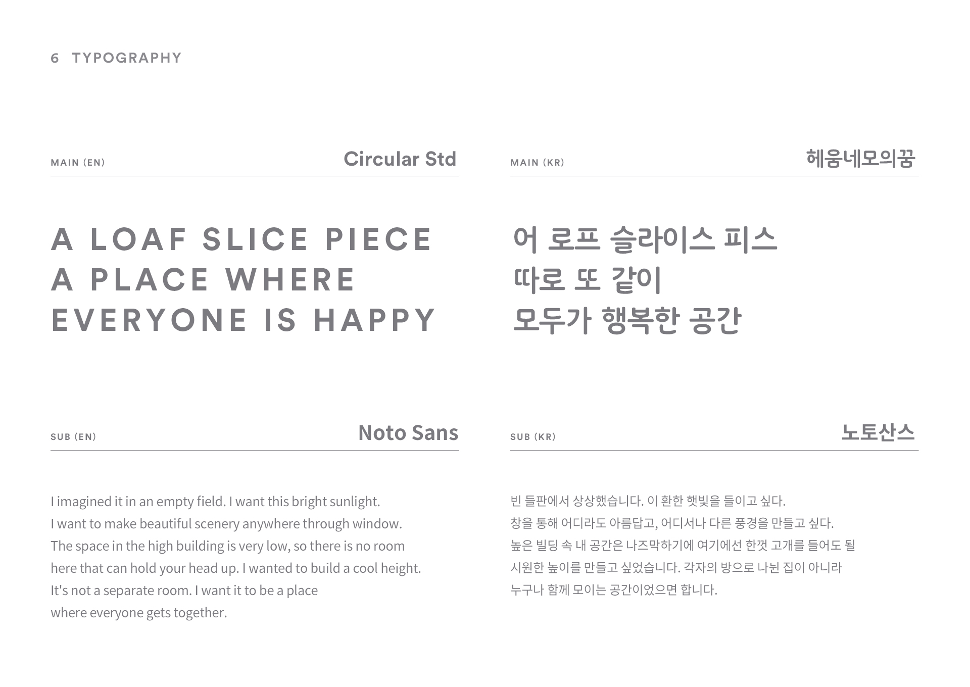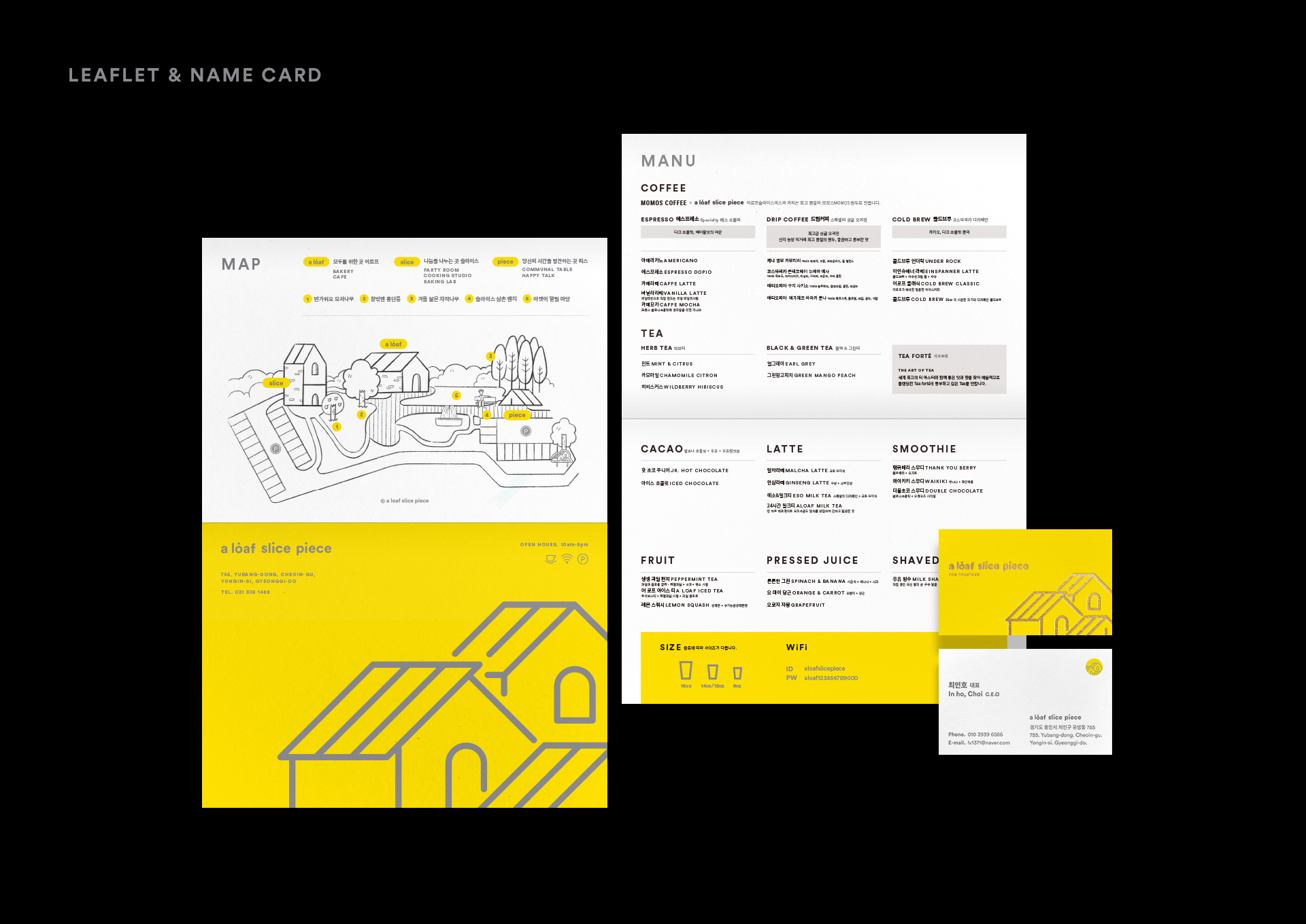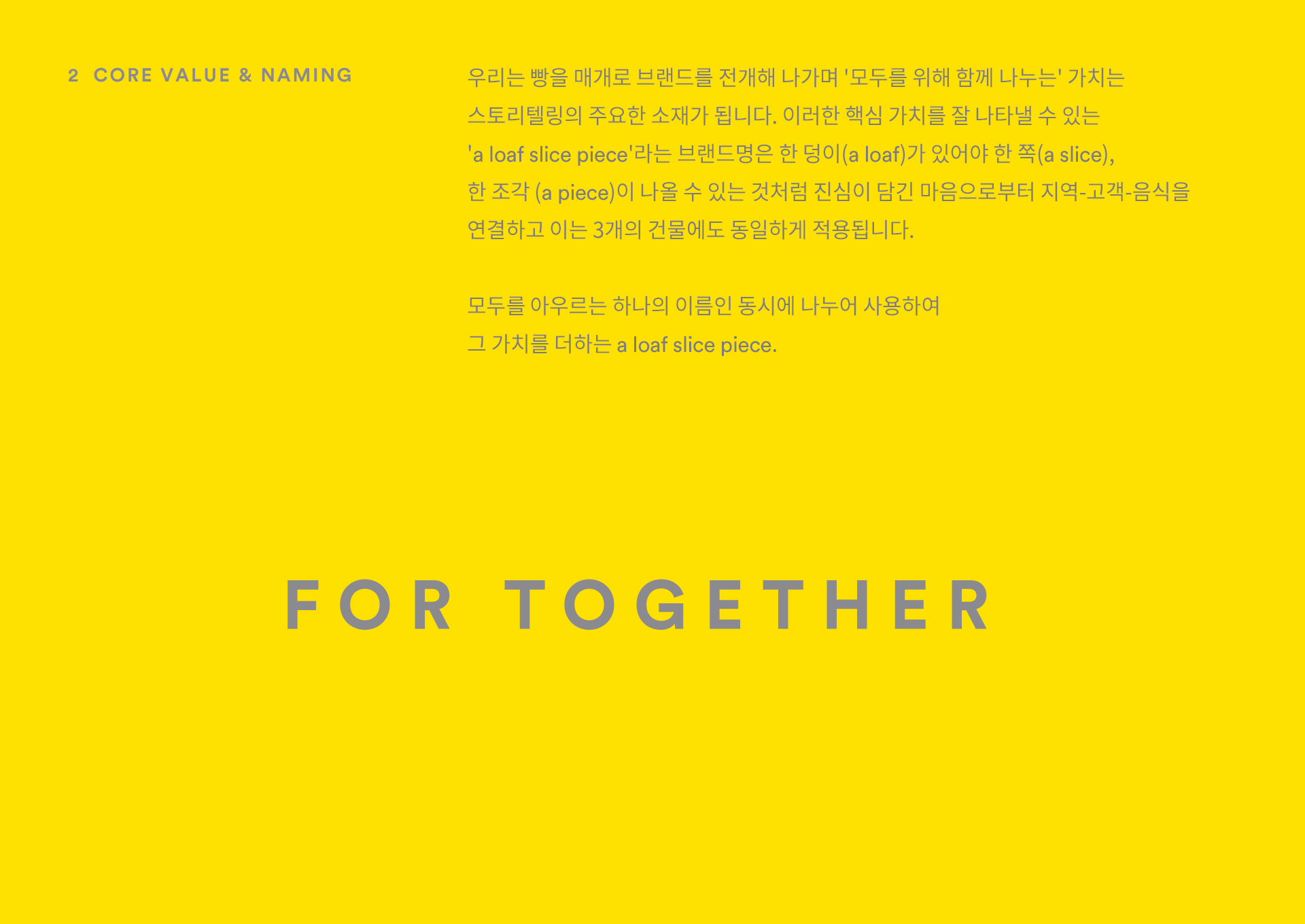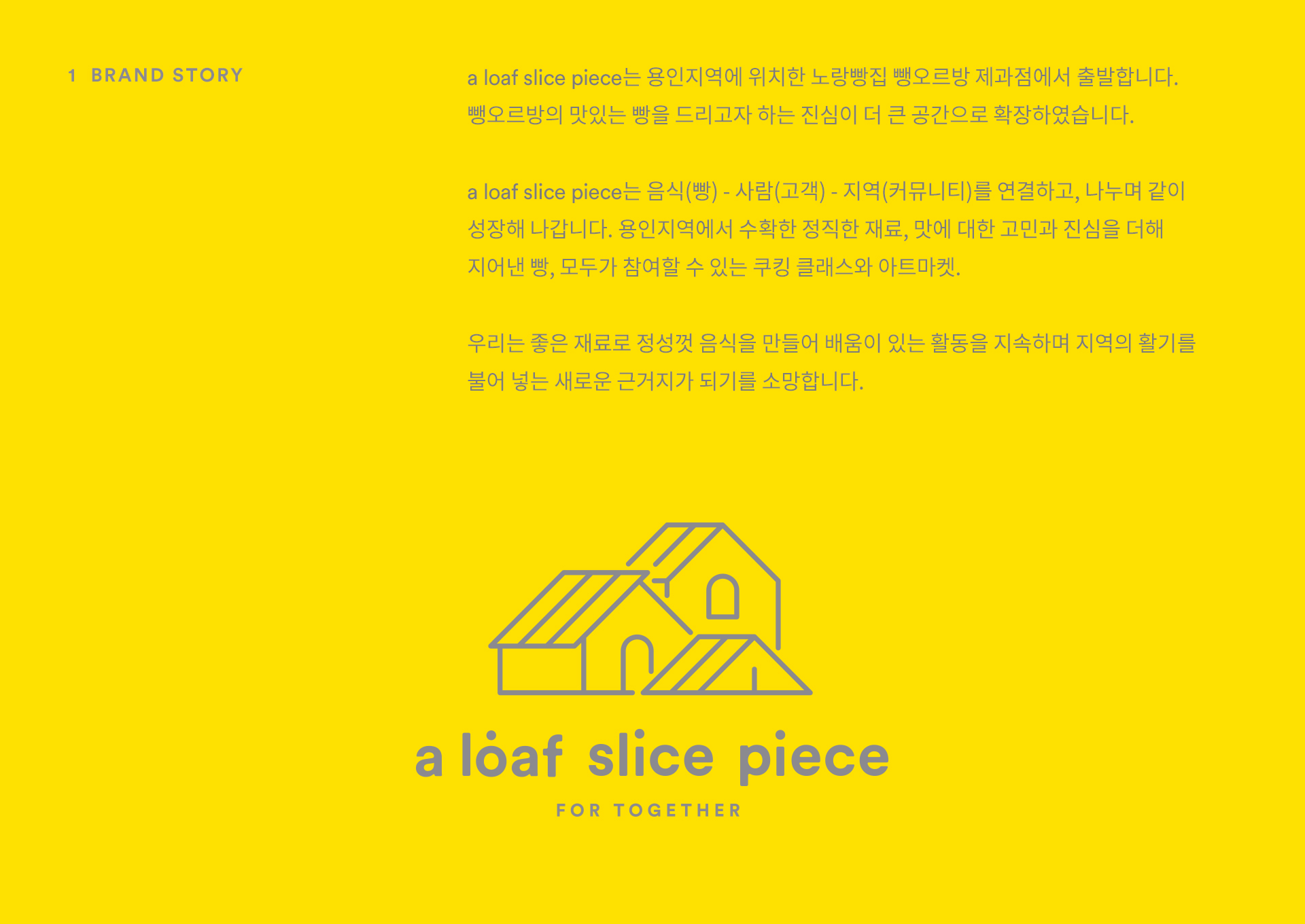 용인에 위치한 베이커리&카페 a loaf slice piece의 브랜드 아이덴티티 작업입니다. 용인 지역에서 노랑빵집으로 알려져 있는 '뺑오르방'의 진심이 확장된 a loaf slice piece는 넓은 부지에 '모두를 위해 함께 나누는' 가치를 실현하기 위해 세워졌습니다.
