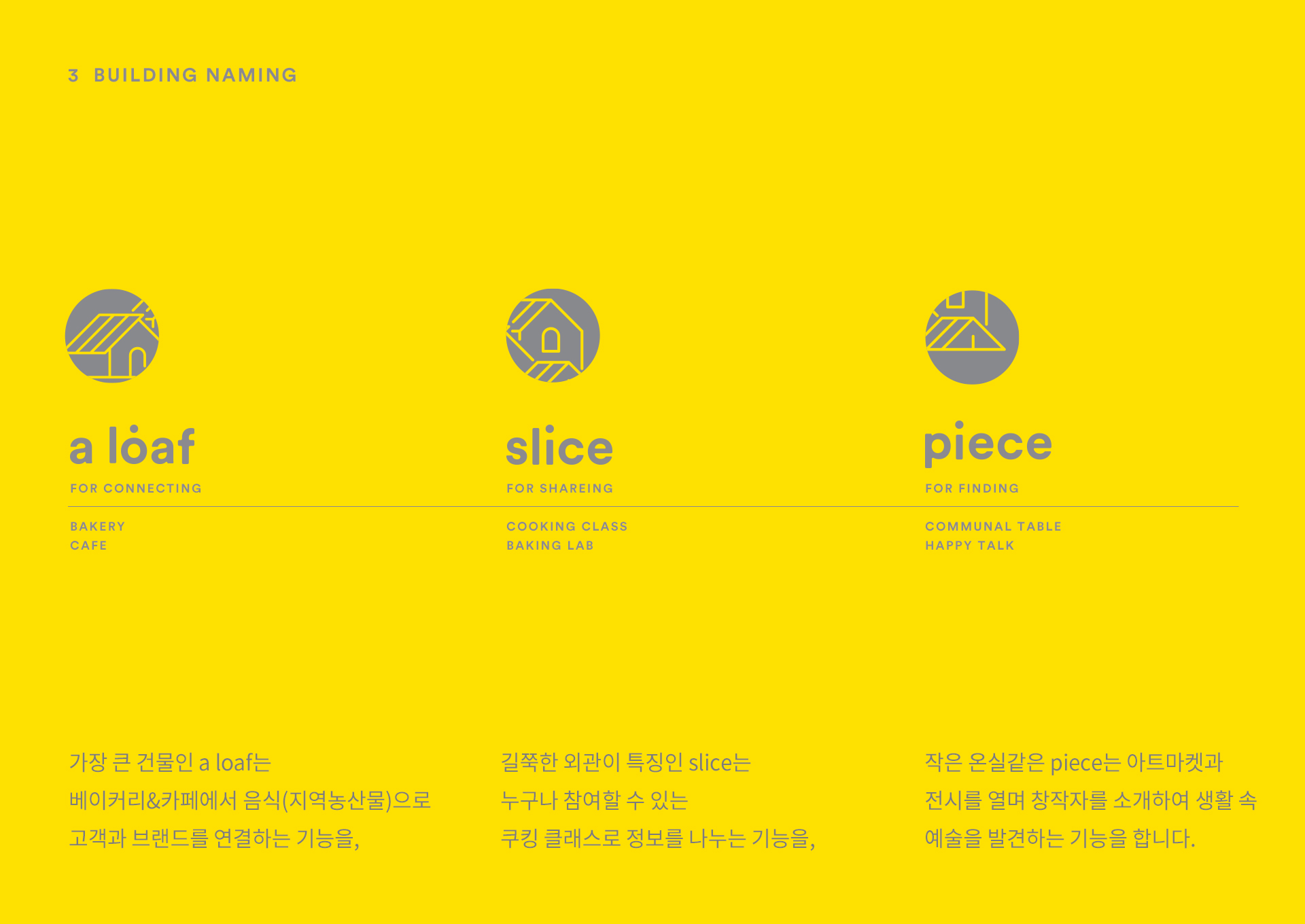저희는 '진심'과 '함께 나누는'이라는 브랜드의 핵심 가치 정립과 그 가치를 담아낸 네이밍, 아이덴티티 및 어플리케이션을 디자인 했습니다. a loaf slice piece라는 브랜드명은 한 덩이(a loaf)가 있어야 한 조각(a slice), 한 쪽(a piece)으로 나누어질 수 있는 것처럼 지역-고객-음식을 연결하고 이를 3개의 건물동에 적용하여 연결-나눔-발견 이라는 기능까지 담아냅니다.